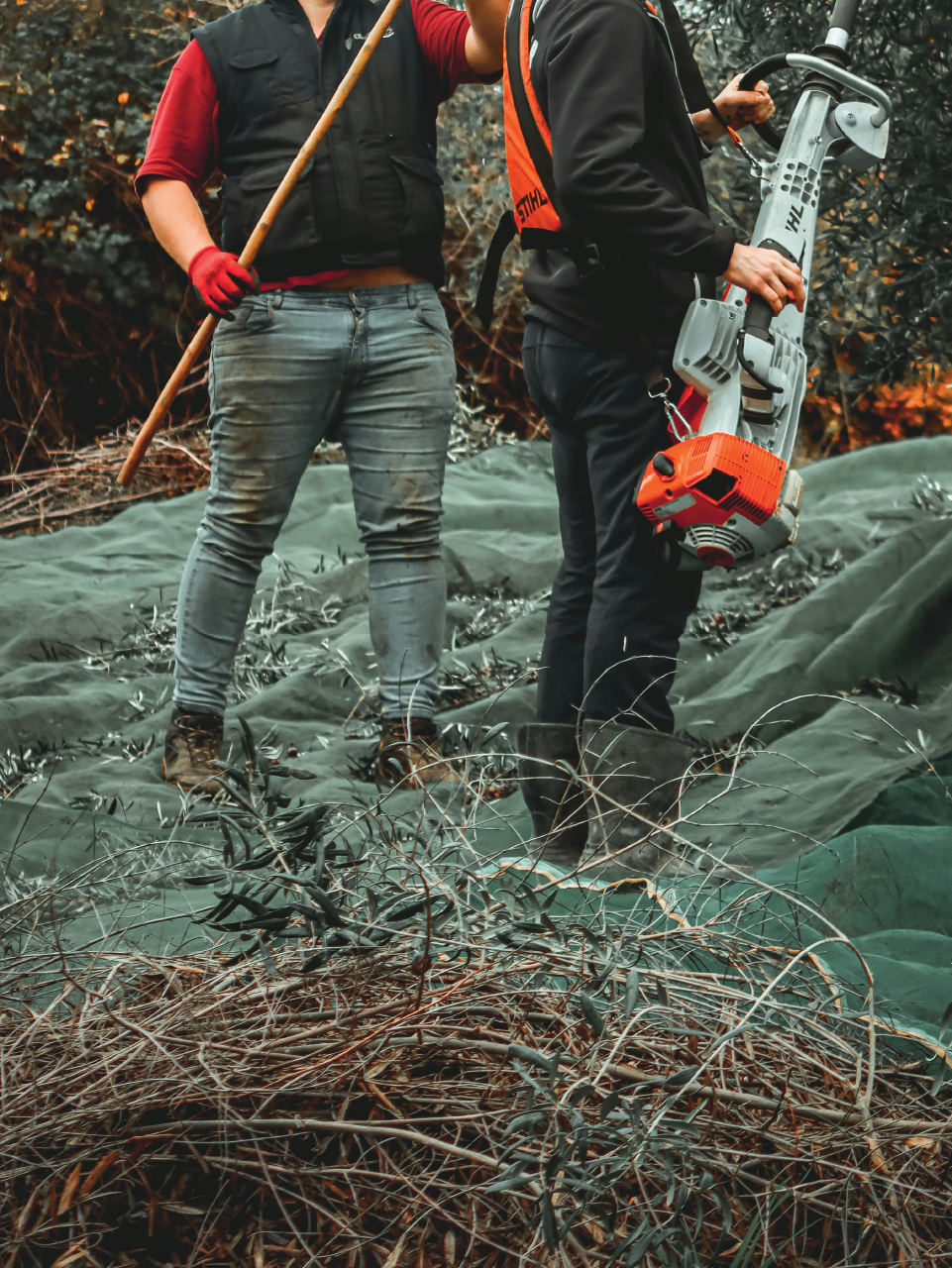 Cuidamos das oliveiras de forma regenerativa, recorrendo a técnicas que conservam e até melhoram a fertilidade do solo, como o uso de cobertos vegetais, a não mobilização profunda do terreno e a poda consciente, que protege a estrutura da árvore e reduz o desperdício.